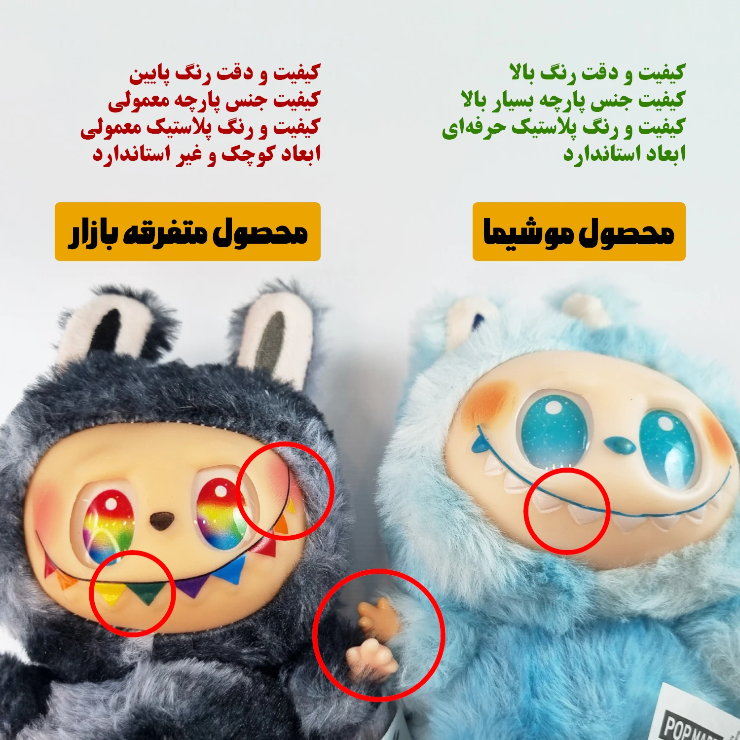 عروسک لبوبو سری انرژی در موشیما با کیفیت مستر کوالیتی عرضه میشود؛ ابعاد استاندارد، پارچهای نرم و بادوام، پلاستیک صورت باکیفیت و رنگهای شاد و زنده دارد. در نسخه هایکپی، ابعاد کوچکتر، جنس ضعیفتر و رنگهای تیرهتر در پلاستیک صورت دیده میشود.